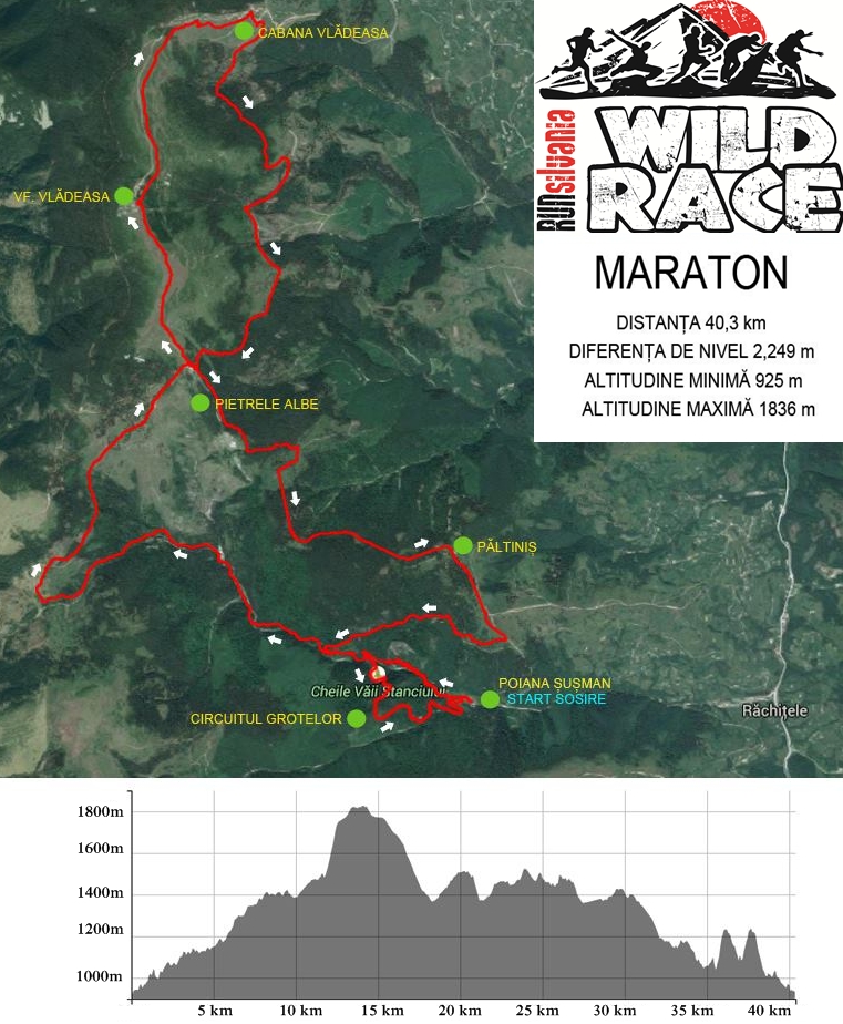 Traseul de maraton măsoară 40.3 km şi are o diferenţă de nivel de 2.249 m. Startul se dă din Poiana Şuşman – Cheile Stanciului, altitudine 925 m. Traseul urmează primii 12 km, în proporţie de aproape 100% drumul forestier / traseul turistic Rachiţele – Vlădeasa (marcaj punct albastru), până la Pietrele Albe. Acest prim segment presupune o urcare lină, dar continuă, trecând pe lângă cascada Vălul Miresei (km 1.5), refugiul Salvamont (km 2) şi intrarea în Valea Seacă (km 4.8, unde se desparte de traseul de semimaraton – PC1). După cca. 500 m, traseul părăseşte pentru o scurtă porţiune drumul marcat, parcurgând o zonă minunată prin pădure, până la un loc de popas pe malul Stanciului, unde se găseşte primul punct de hidtratare (PH1 – km 5.5), apoi revine pe traseul turistic, traversând pârâul pe un podeţ din lemn. În foarte scurt timp, traseul continuă prin pădure, pe malul apei, pe lângă Peştera Vârfuraşul (km 6) urcând pieptiş o pantă de cca 50 m şi revenind pe drumul forestier / traseul turistic, pe care îl urmează trecând prin PC2 (km 7.5) şi pe lângă stânele de pe Făget, unde se gaseşte PH2 (km 10). În acest punct reîntâlneşte traseul de semimaraton, comun până la Pietrele Albe (km 12), la altitudinea de 1500 m, unde se află PA1 / PC3.
